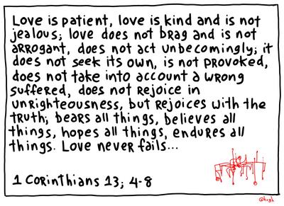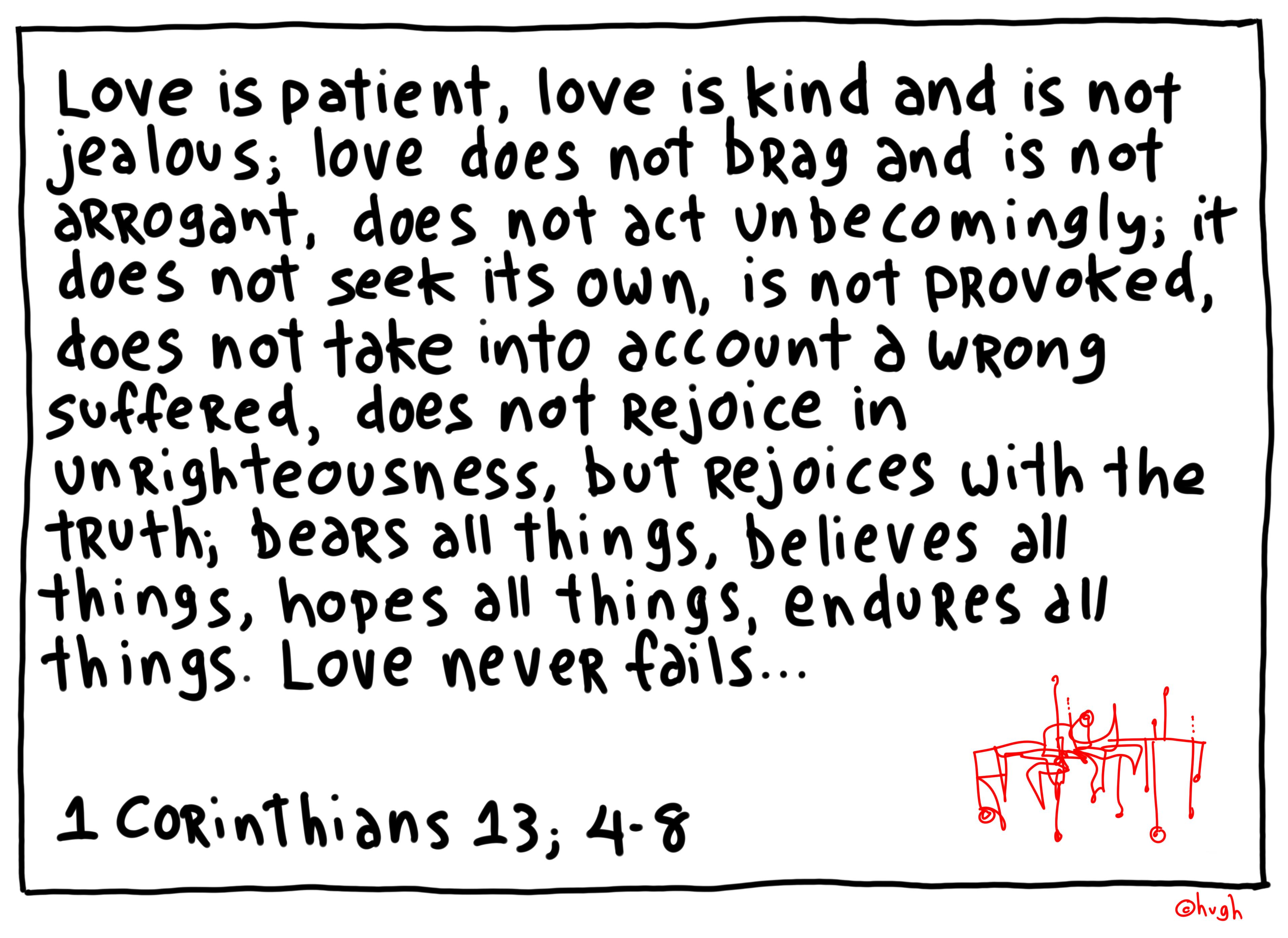 Hate is not patient, is not kind, and is jealous; hate brags and is arrogant, and acts unbecomingly. Hate seeks it’s own, is easily provoked, does not take into account a good deed, rejoices in righteousness, but does not rejoice in truth; bears nothing, believes nothing, hopes nothing, endures nothing. Hate always fails.