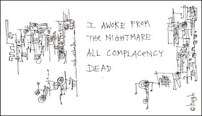 Is complacency the nightmare or its cause – or both? Is compacency to be “dead”? What did you awake TO after the nightmare (apparantly the nightmare is not over, you merely awoke from it)?