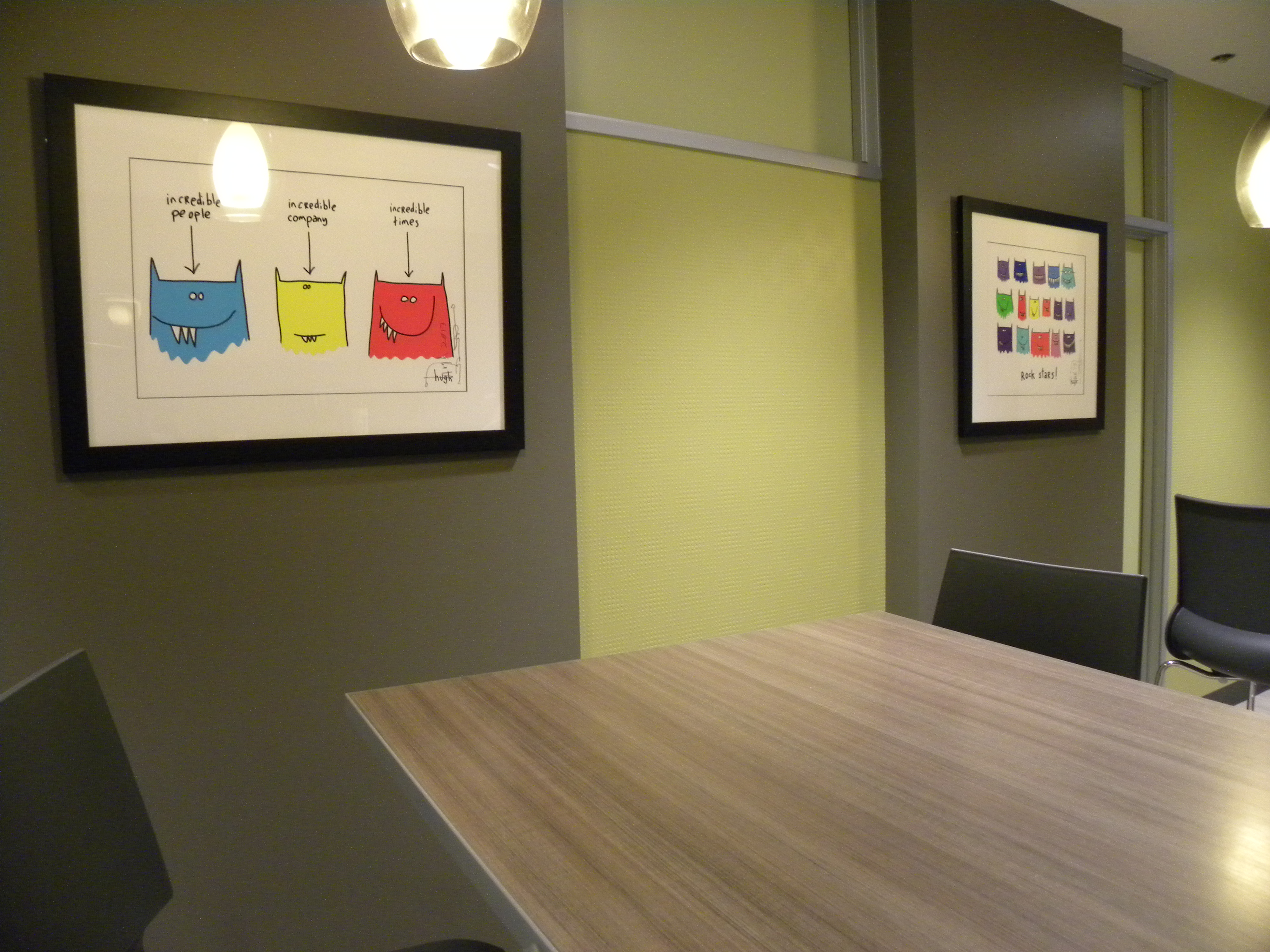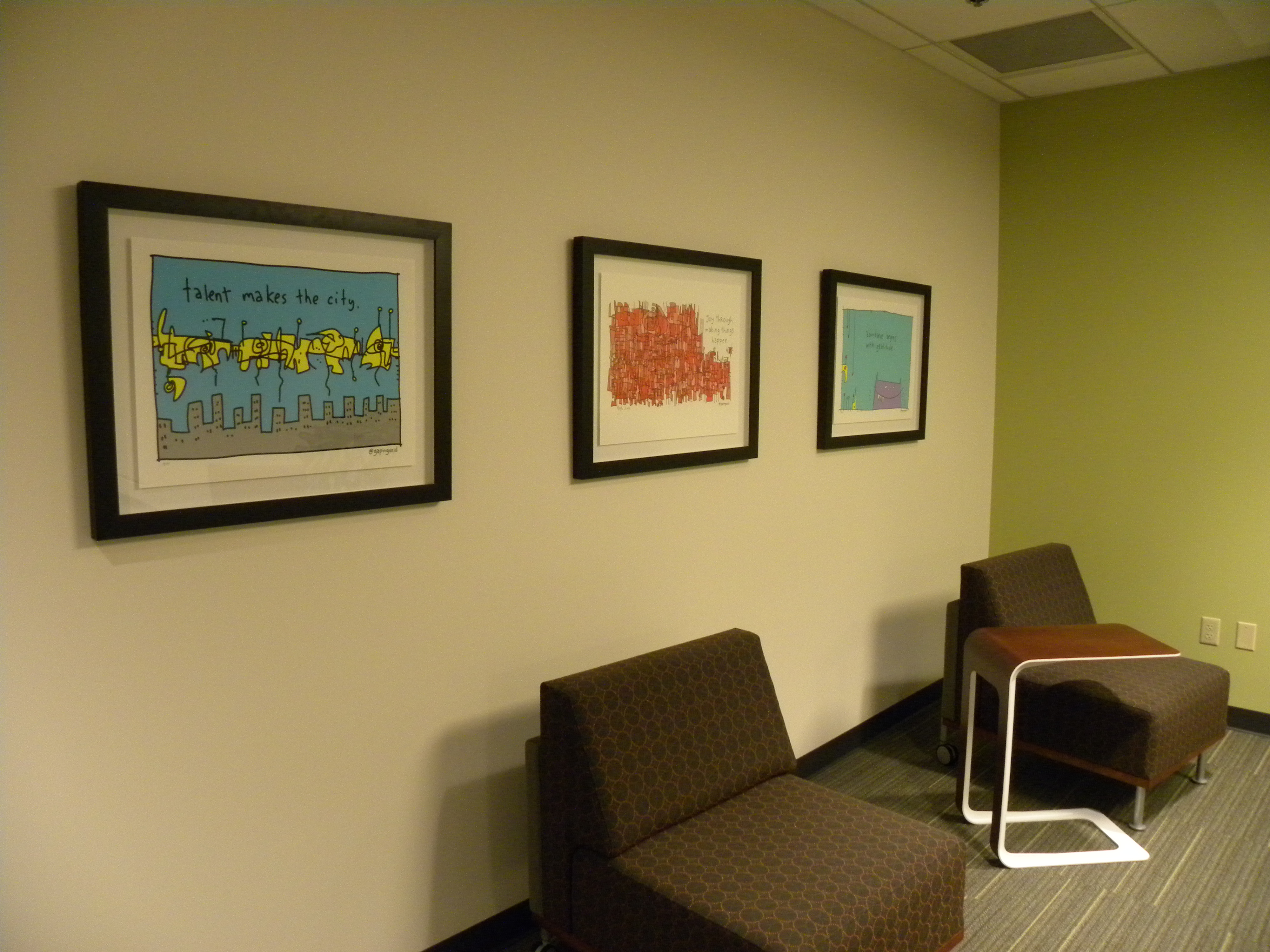 “CREA has a dozen framed prints around the office, and I will occasionally ‘cube grenade’ people’s desks with one of the daily cartoons. My first print was “Ignore Everybody” but my most prized is a 1991 original abstract piece that Hugh painted in his cubicle while at Leo Burnett.”