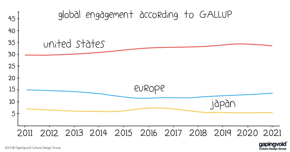 Derek Thomson over at The Atlantic adds that compared to Canada, Australia, every country in Europe and Japan, the data says Americans are “astonishingly happy and engaged” with their work. Apparently the US job satisfaction is *six* times higher than Japan’s. Six!