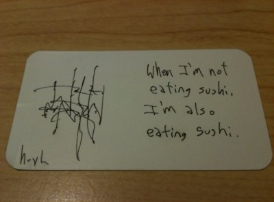 Earlier this week there was a fun little Tweetup at a sushi restaurant here in Miami Beach. I drew this cartoon on the back of @sushi_pro‘s businesscard… Rock on.