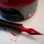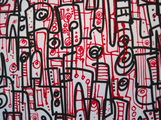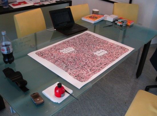 I drew the black lines on my Tablet PC, then printed the image out on high-grade art paper. Then I sat down and painstakingly applied the red ink by hand, with an old-fashioned dipping pen.
