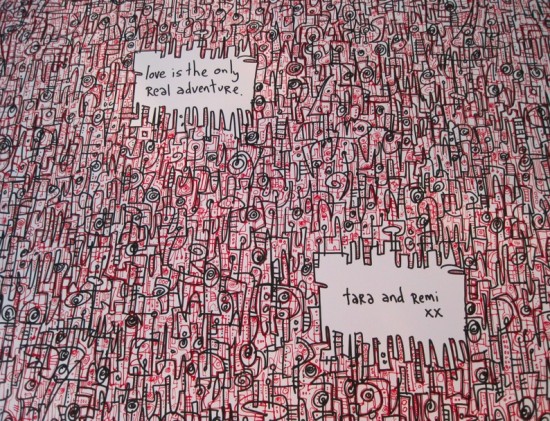 As I understand it, when they first became a couple, they spent a lot of time traveling abroad and having all sorts of wonderful adventures together. So I used that as the intellectual starting point for piece: “Love + Adventure” etc.