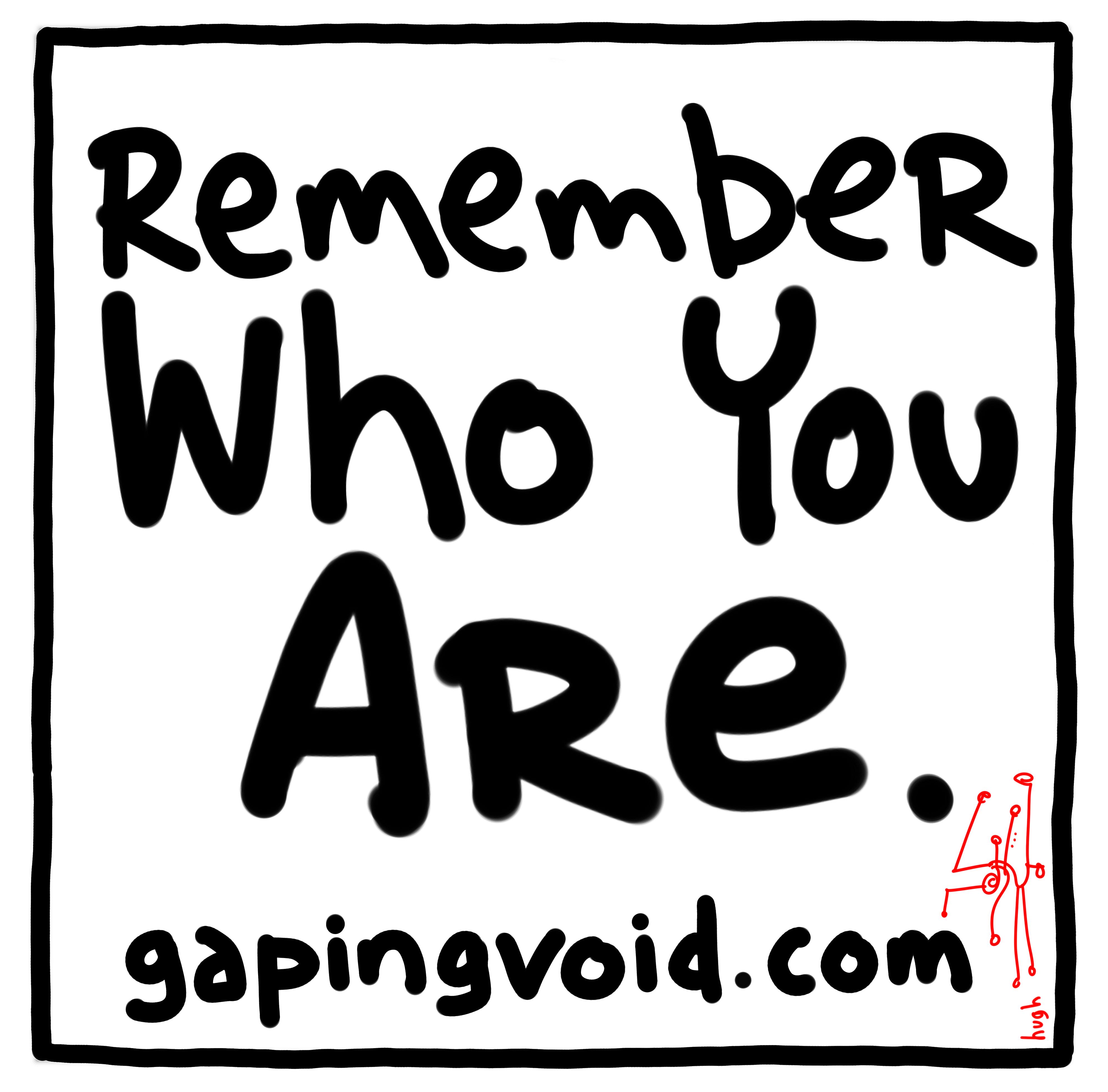 […] with people, I’ve been enjoying the call to action issued by Hugh MacLeod, aka Gaping Void, with his “Remember Who You Are” manifesto. It’s a wake up call. We should all remember who we are. The truth will […]